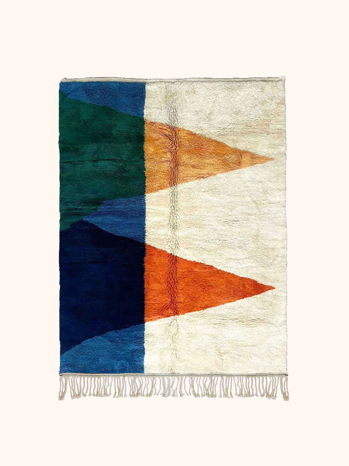 Bold, modern, yet deeply rooted in tradition, the Peaks of the Atlas rug embodies the raw beauty of Morocco’s mountain landscapes. Striking triangular forms in rich forest green, deep navy, and burnt orange rise against a soft ivory backdrop, resembling the towering peaks of the Atlas bathed in sunlight. This geometric masterpiece is a fusion of heritage and contemporary design, handcrafted with plush wool to bring warmth, depth, and a touch of Moroccan artistry to any space.